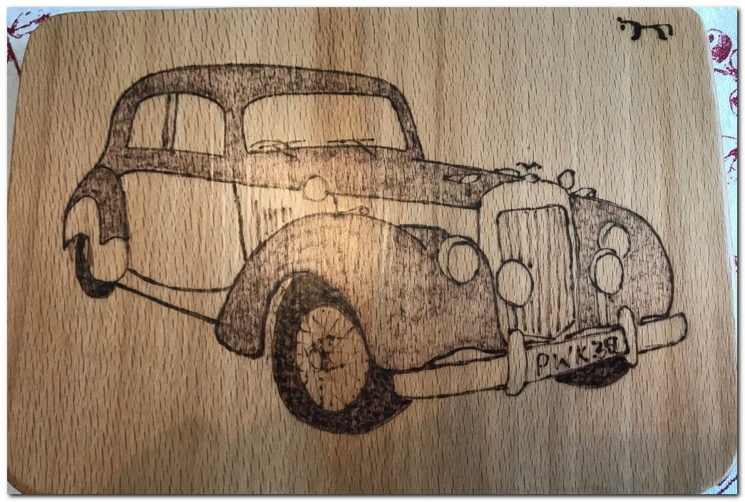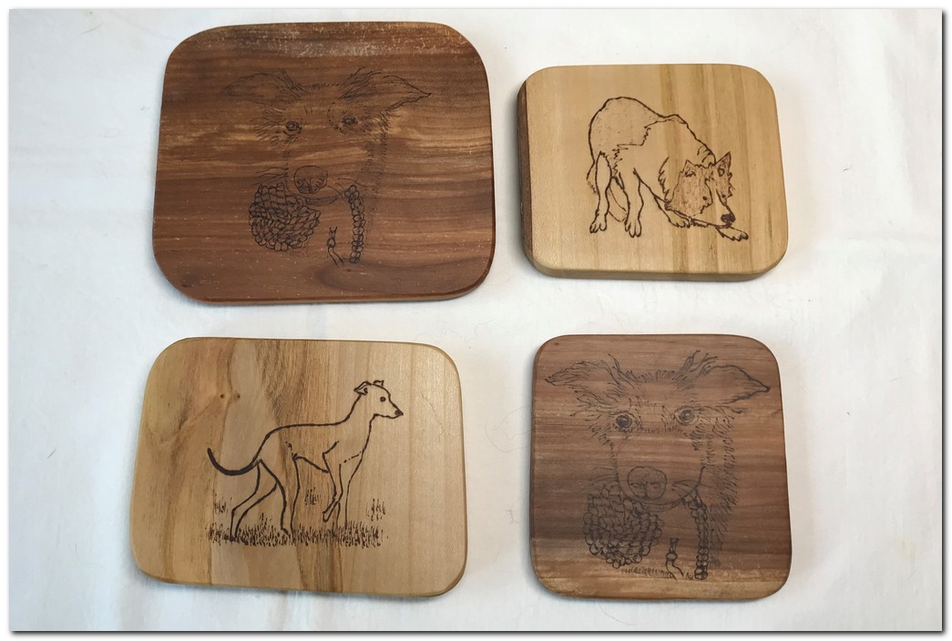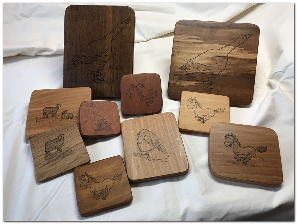 Animals, birds, cars etc. can be pyrographed onto wooden coasters and then finished with 3 coats of polyurethane. Coasters can range in size from 3" x 3" to 5" x 6" Generic coaster guide price: £7 - £12 We also personalise coasters from information, photo, sketch etc. provided by the client. These are a size and timber as agreed with the client. Guide price: £10 - £25 |